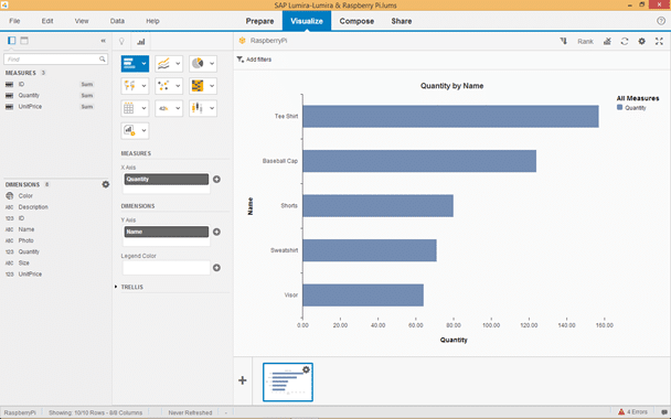 そして、Lumira 内のデータを操作して、他のデータソースと同様に visualizations を作成できます。