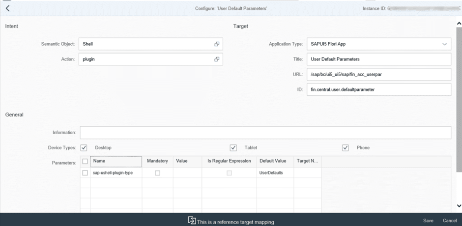 The Default Values dialog that appears in the Settings tab in the Me Area is assigned to users by including the Shell plugin target mapping in any of the tile catalogs assigned to their business role. For example, you can do this by assigning the business catalog SAP_SFIN_BC_USER_PARAM to the users’ security role.