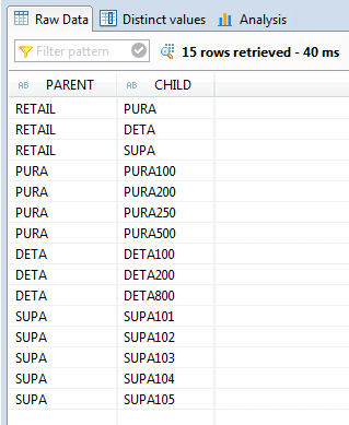 SELECT TOP 2000 DISTINCT “PARENT”, “CHILD”, SUM(“UNITS_SOLD”) AS “UNITS_SOLD_SUM”