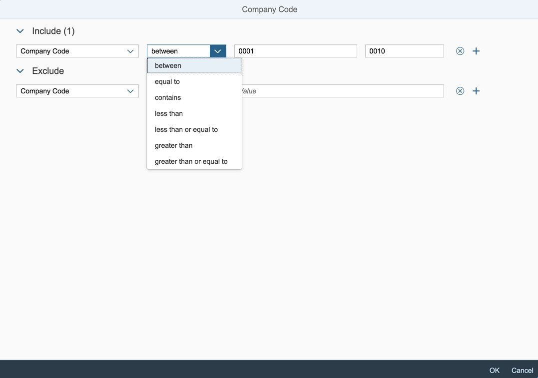 Some app parameters support extended values, where multiple values or value ranges can be provided for the same app parameter. In this example, you can see how the target mapping for the Manage Journal Entries app is assigned to extended default values for Company Code, Fiscal Year, and Accounting Document Type.