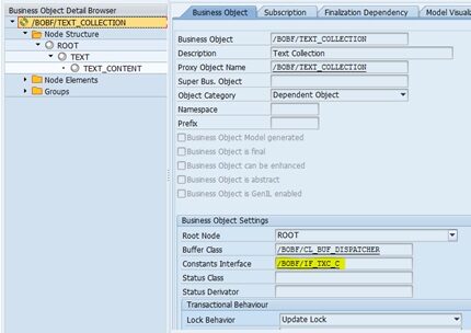 For any CRUD operation over this node we need the Node key and association key which will be available only at the runtime. The Constants Interface for /BOBF/TEXT_COLLECTION Business Object is /BOBF/IF_TXC_C.