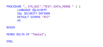 Once the data is loaded, another stored procedure, “_SYS_BIC”.”TEST::DATA_MERGE” is called. This is to merge delta of Table2, to move the data from delta storage to the main storage in HANA as recommended by SAP.