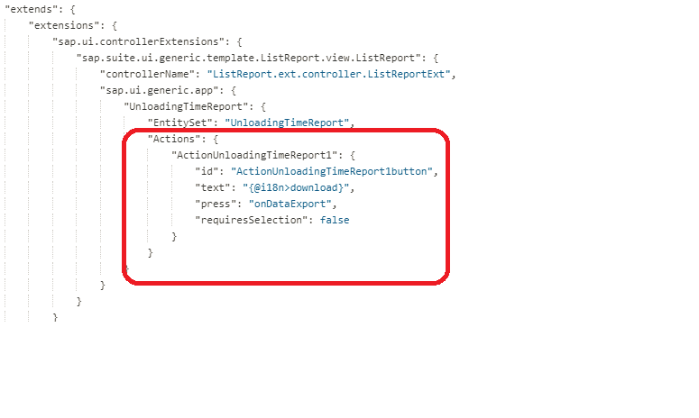 To Add the Custom action to the annotation based list report modify the manifest.json add the below code snippet and in extended controller file write the js function that is mentioned for press action “onDataExport.