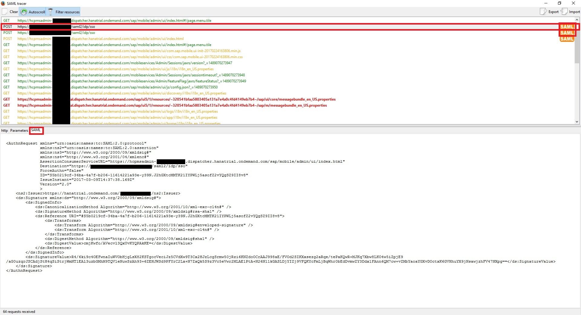 Now, navigate to the Mobile Services Cockpit url and when you get redirected to the IdP login page, enter valid user credentials to authenticate to the IdP. The SAML trace will contain the decoded SAML request from Mobile Services Cockpit to IdP.