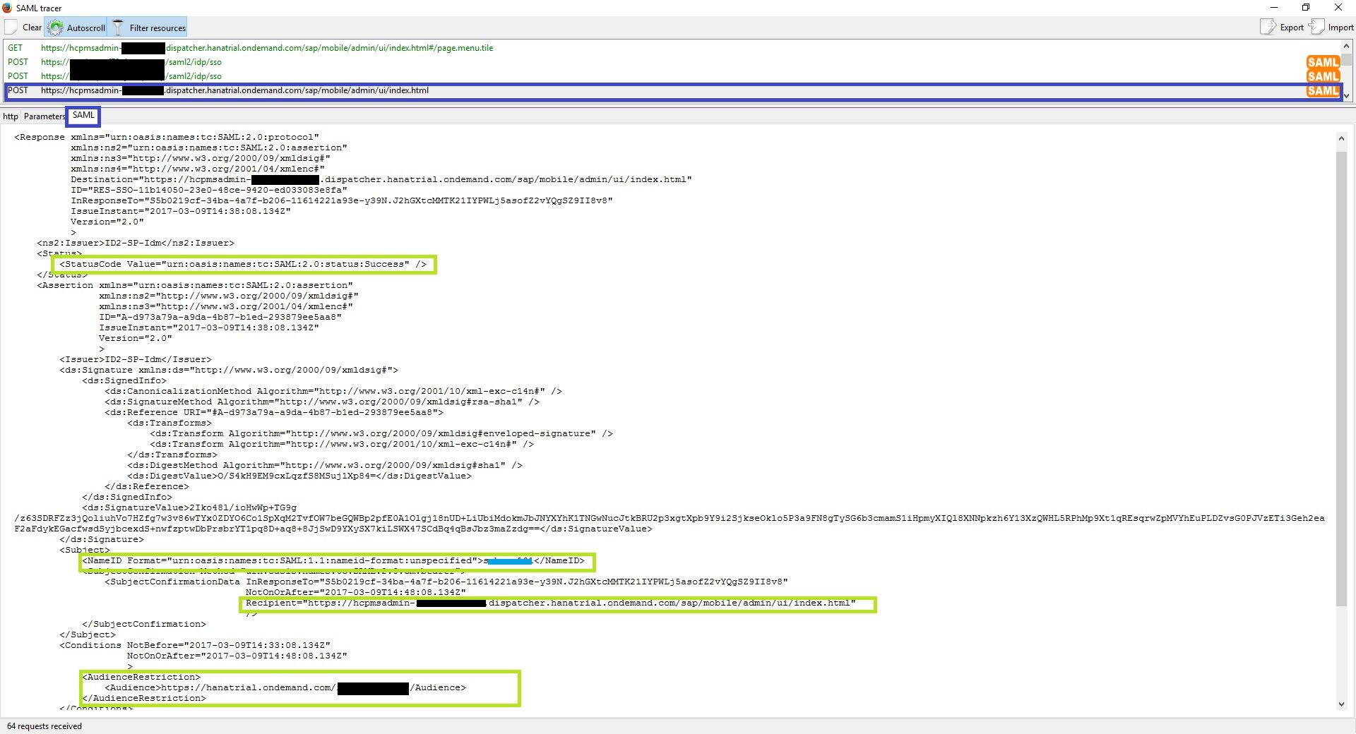 When redirected to the IdP login page, enter valid user credentials to authenticate to the IdP. Upon successful authentication, you will be redirected to Mobile Services Cockpit. At this point the SAML tracer will have captured the SAMLResponse posted from the IdP to the SAP Cloud Platform.