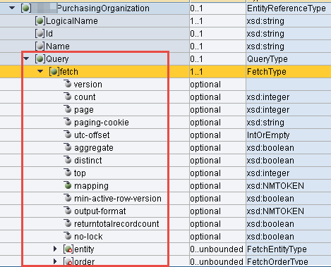 However, the adapter introduces a query feature that is available during schema generation. This adds a Query section in the generated schema as shown below. This allows the query (based on FetchXML) to be constructed during design time, and executed by the adapter automatically during runtime. From PI monitoring point of view, there is only a single PI message, but internally the adapter calls the Dynamics CRM system multiple times – initially to query all the required data, and finally constructing the request message for a final call.