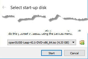 - In the dialog that appears, navigate to the downloaded openSuse installation file which you downloaded in Step 2, eg openSUSE-Leap-42.1-DVD-x86_64.iso.Then select this drive, choose OK: