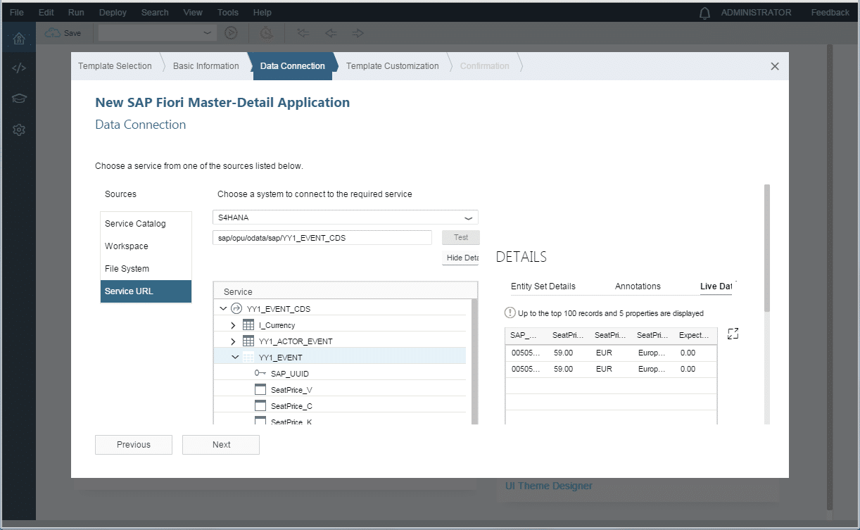 - On the step Data Connection, select Service URL. Select the destination you created before and the relative path of the OData service, as given in the Communication Arrangement screen. You can now discover the details of the service and you can even discover the live data (see the screenshot below)