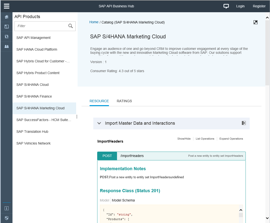 Screenshot: SAP API Business Hub showing the details of a S/4HANA cloud service