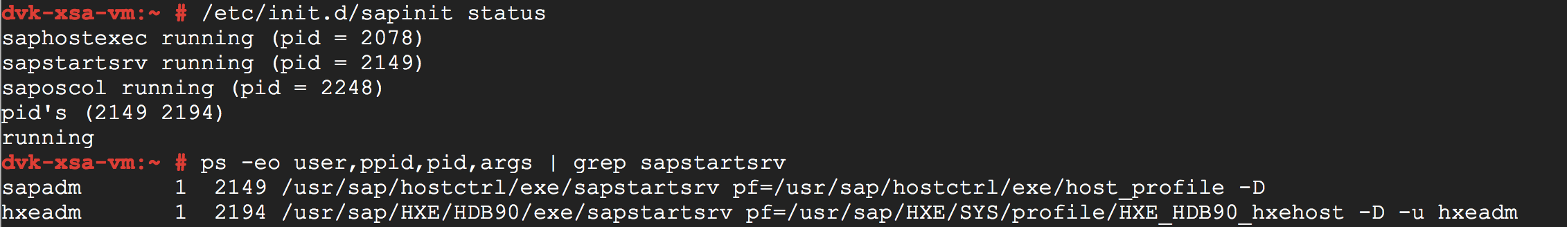 Note that both SAPStartSrv processes have as parent process (PPID) init process (1) and are started as a service, or in Linux speak, as a daemon (-D).