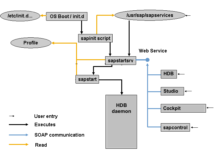 Schematically, the process looks like this: with services manager [OS Boot] calling sapinit, reading sapservices, starting sapstartsrv, starting sapstart, starting HDB daemon, starting HDB processes.