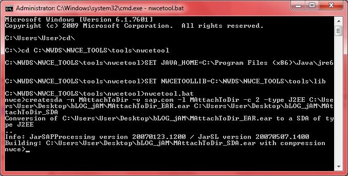 - createsda -n MAttachToDir -v sap.com -l MAttachToDir -c 2 -type J2EE C:UsersUserDesktopLOG_jAMMAttachToDir_EAR.ear C:UsersUserDesktopLOG_jAMMAttachToDir_SDA