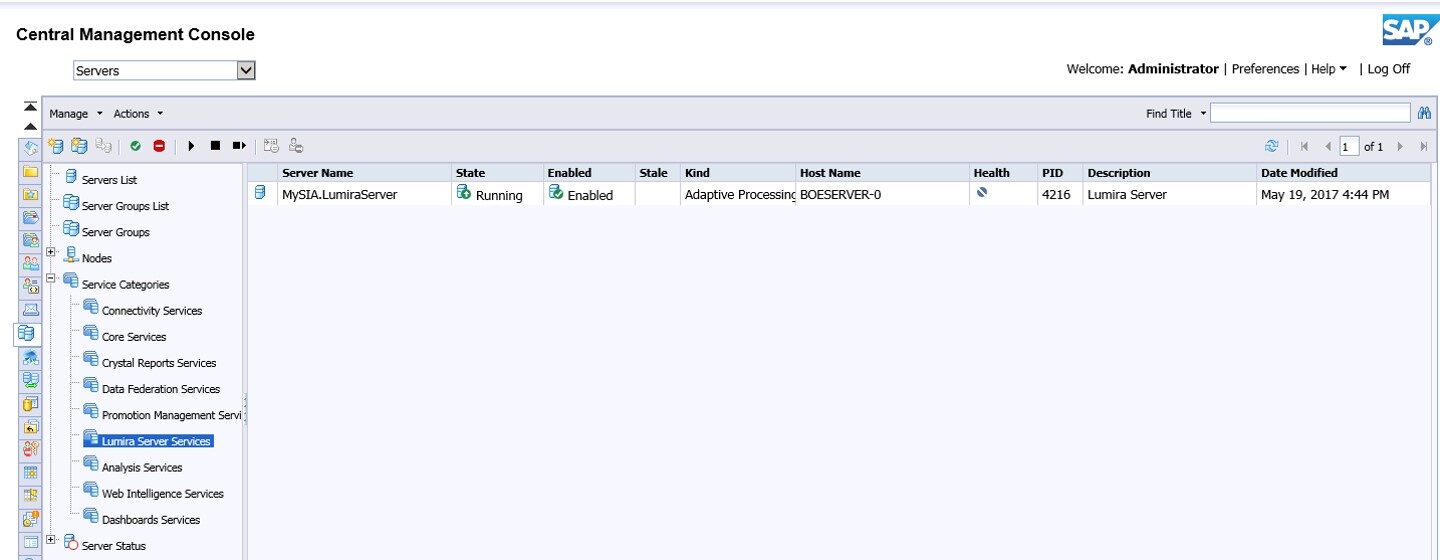 Before I apply the ‘full’ Lumira 2.x BI Platform Add-on you can see my existing Design Studio service defined in the Central Management Console. I have a dedicated Adaptive Processing Server with two services: ‘Analysis Application’ (the Design Studio processing server) and ‘DSL Bridge’ (for processing my Universe queries from within my Design Studio applications).