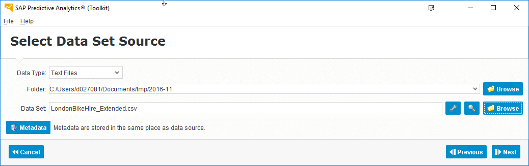 This would be the time to load the data that you’d like to investigate into SAP HXE. For the sake of example, we’ll use the time-series data that is described in Andreas’ guide Hands-On Tutorial SAP Predictive Analytics, Automated Mode: Time Series Analysis. We steal its data LondonBikeHire_Extended.csv, download it to our PC and subsequently upload it to our SAP HXE instance using SAP HANA Studio.