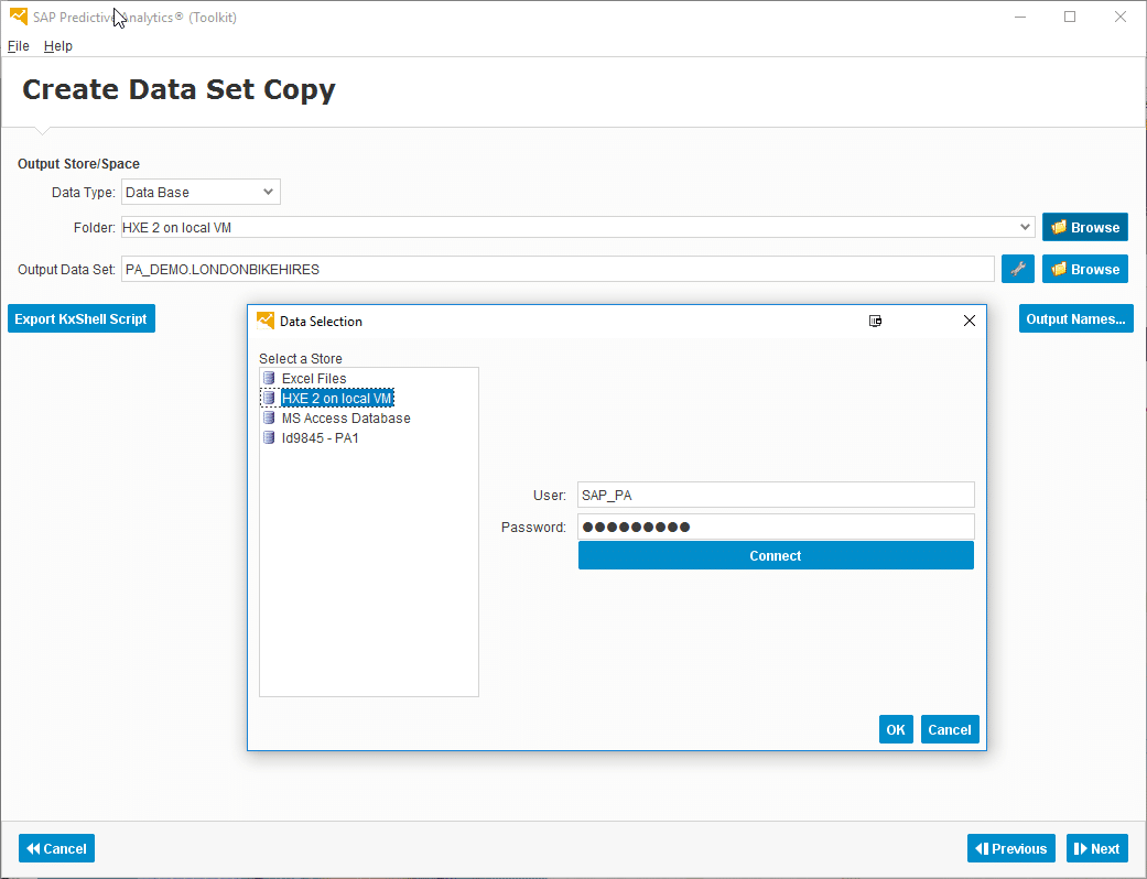 - SAP HANA, express edition is our target location for the data transfer. To achieve this, choose Data Type Data Base, choose the ODBC driver we configured above, connect to it using the user created earlier and define a new target table in our newly created schema using the dot-notation as in PA_DEMO.LONDONBIKEHIRES.